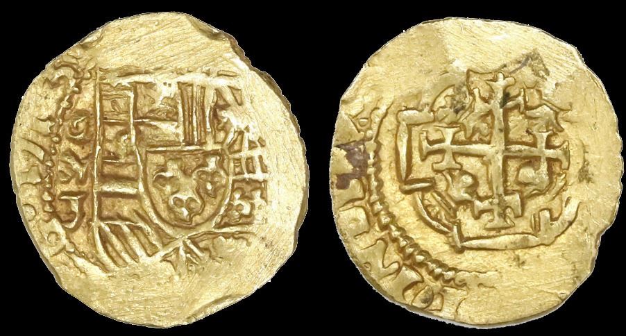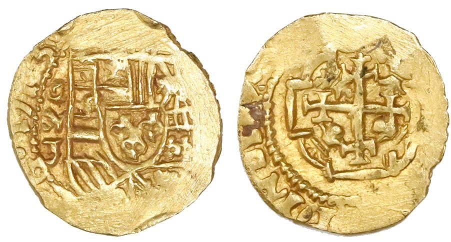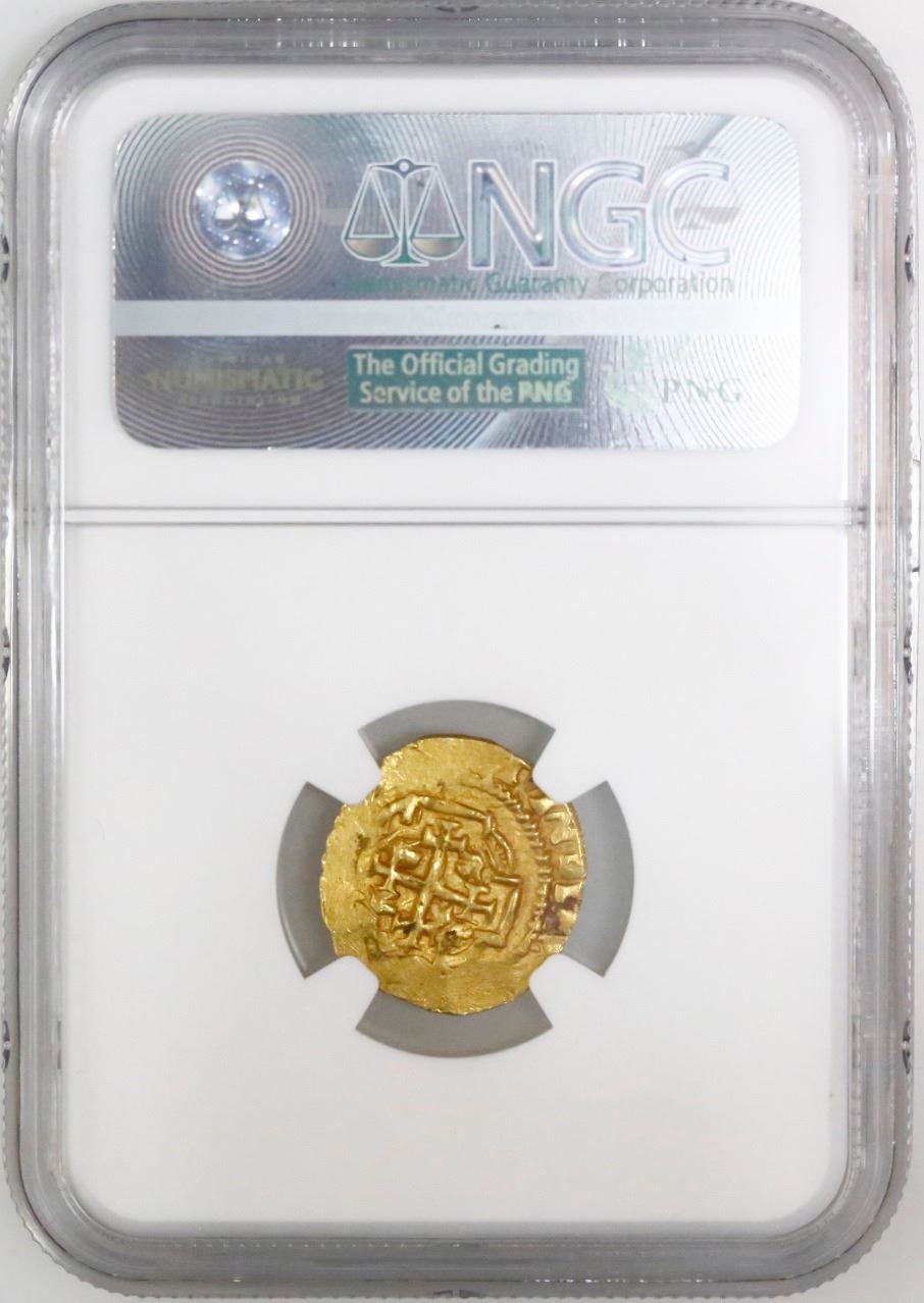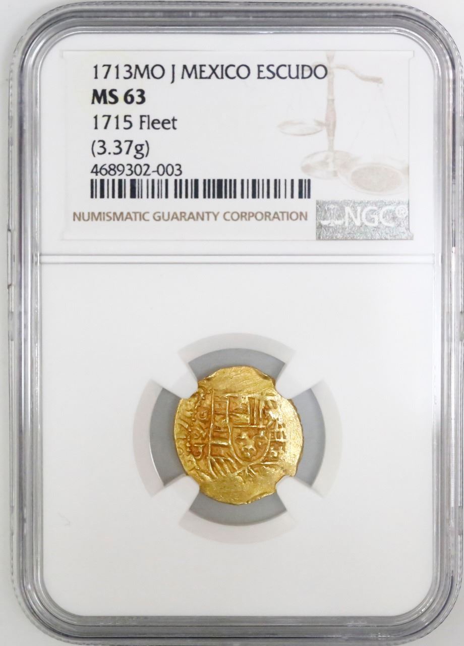 Mexico City, Mexico, cob 1 escudo, 1713J, mintmark oM, NGC MS 63, ex-1715 Fleet (designated on label). S-M30; KM-51.2 for type. 3.37 grams. Prior to the sea change in style in 1714, the mintmark on Mexican gold was universally oXM with the exception of some oM 1 escudos of the style of 1711-13, and almost all the known examples with visible dates have been 1712. This 1713-dated example is therefore quite rare. The date is clear, the mintmark and shield are bold and full and the cross nearly so, with dark red toning all over. Finest graded in NGC census. NGC #4689302-003. From the 1715 Fleet.