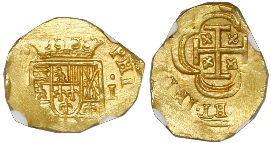 Mexico City, Mexico, cob 1 escudo, (1714)J, NGC MS 65, ex-1715 Fleet. S-M30; KM-51.2; CT-510. 3.36 grams. Lustrous and crisply detailed per the grade and type, with most of shield and crown, nice full cross (slightly off-center), PHI- of king's name in legend. From the 1715 Fleet. NGC #4701989-005.