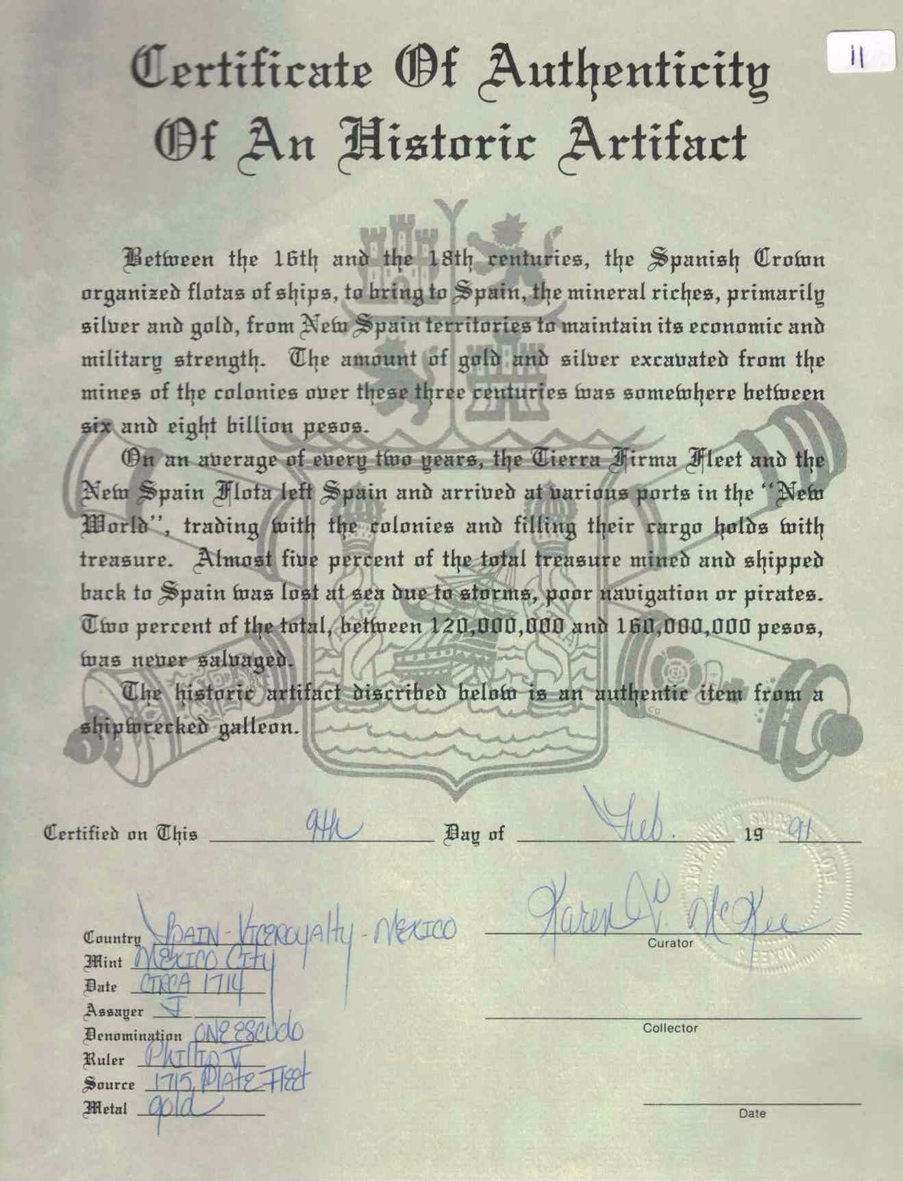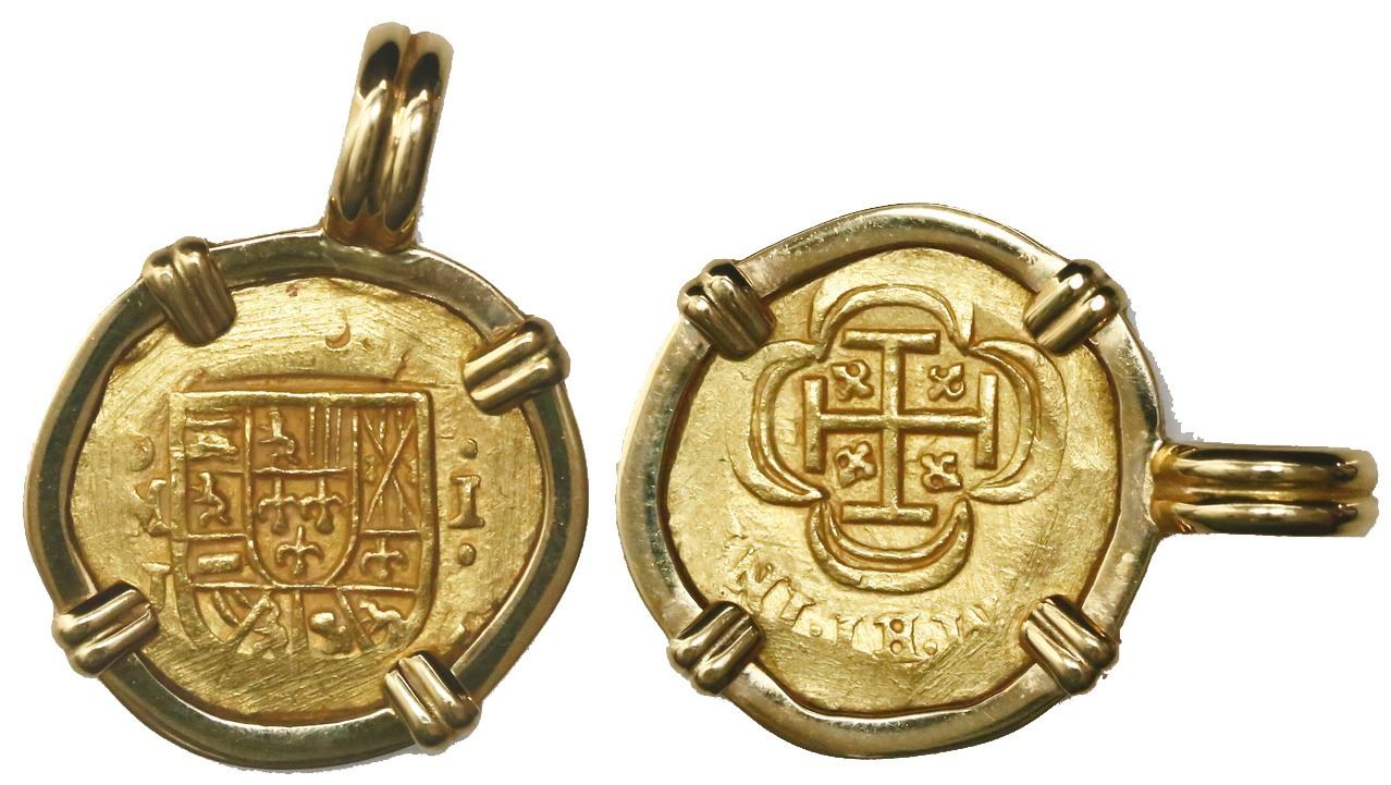Mexico City, Mexico, cob 1 escudo, (1714), assayer J, mounted in 18K pendant-bezel, from the 1715 Fleet. S-M30; KM-51.2; CT-510. 7.26 grams total. Choice full shield and cross (both well centered and almost axially aligned) but peripheries flat, bold denomination and clear oMJ, nearly round, UNC details. From the 1715 Fleet, with certificate.