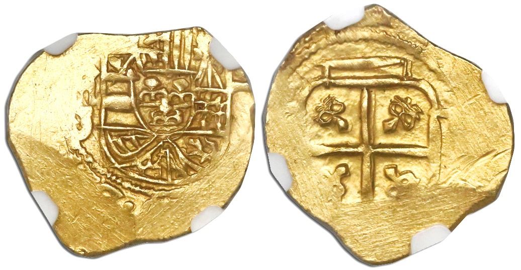 Mexico City, Mexico, cob 1 escudo, Philip V, assayer J, style of 1705-10, NGC AU 50, ex-1715 Fleet. S-M30; KM-51.1. Lustrous Mint State (despite what the slab says), with bold full shield and nearly full cross, broad flan with flat parts near edge, full assayer J. From the 1715 Fleet, pedigreed to our Auction #11, with original lot-tag #15.