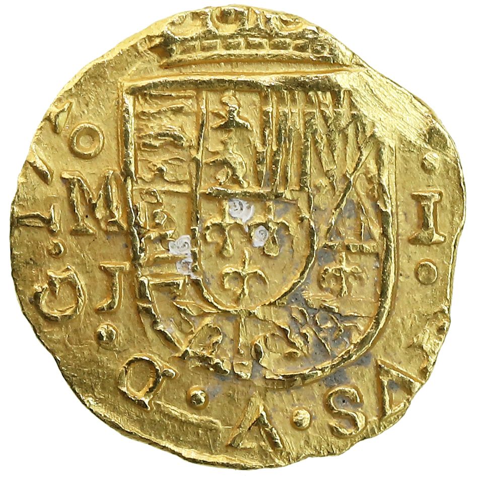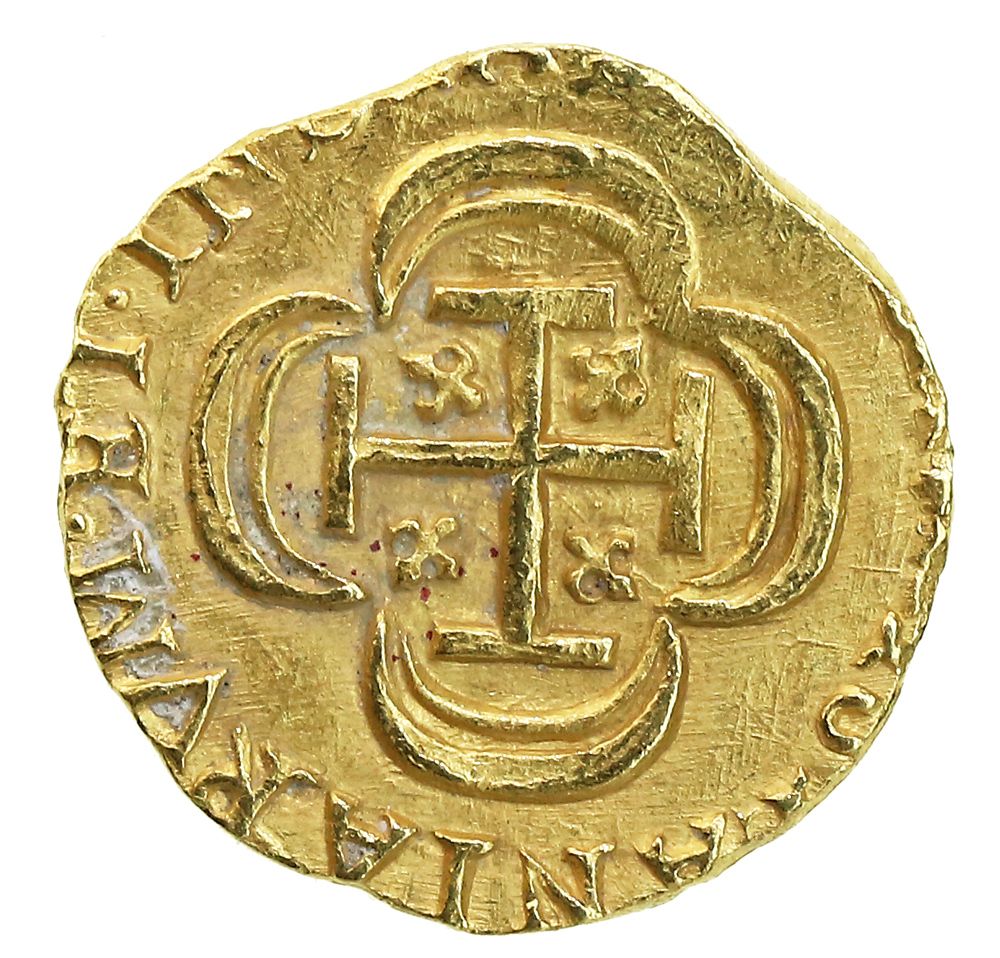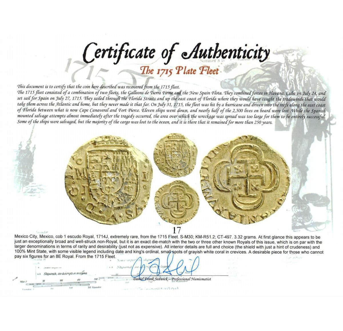 Mexico City, Mexico, cob 1 escudo Royal, 1714J, extremely rare, from the 1715 Fleet. S-M30; KM-R51.2; CT-497. 3.32 grams. At first glance this appears to be just an exceptionally broad and well-struck non-Royal, but it is an exact die-match with the two or three other known Royals of this issue, which is on par with the larger denominations in terms of rarity and desirability (just not as expensive). All interior details are full and choice (the shield with just a hint of crudeness) and 100% Mint State, with some visible legend including date and king's ordinal, small spots of grayish white coral in crevices. A desirable piece for those who cannot pay six figures for an 8E Royal. From the 1715 Fleet.
