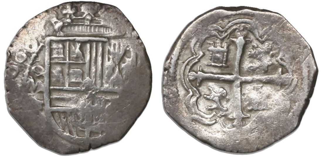 Mexico City, Mexico, cob 1 real, 1608F, rare. S-M15; KM-27.2; CT-449. 3.36 grams Clear bottom 2/3 of date, full mintmark, good full shield and crown and cross, non-toned AXF.