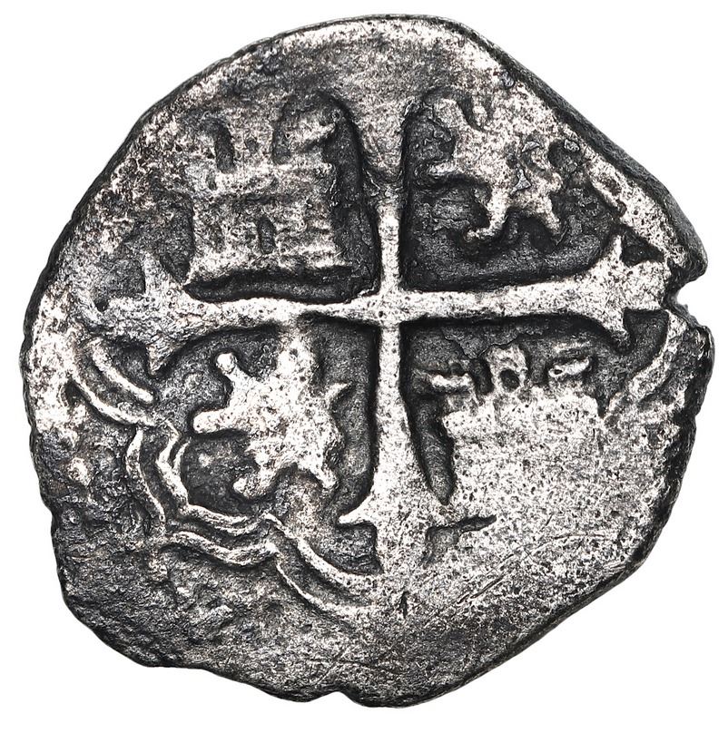 Mexico City, Mexico, cob 1 real, 1613 F, rare, ex-Concepcion (1641). S-M17; KM-27.2; Cal-492. 2.71 grams. Choice full date and oMF, good full cross and nearly full shield, VF details but a bit thin from light corrosion, patchy dark toning. From the Concepcion (1641).