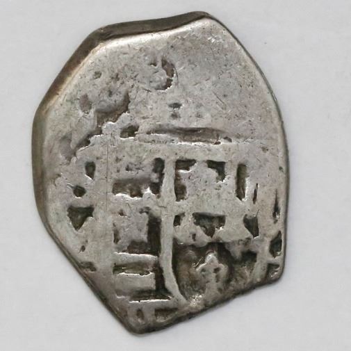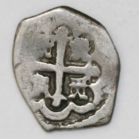 Mexico City, Mexico, cob 1 real, 1728/7(D), rare. S-M23a; KM-unl (30 for Type). 2.49 grams. Clear date, nearly full cross and shield, only VG but with some contrasting toning.