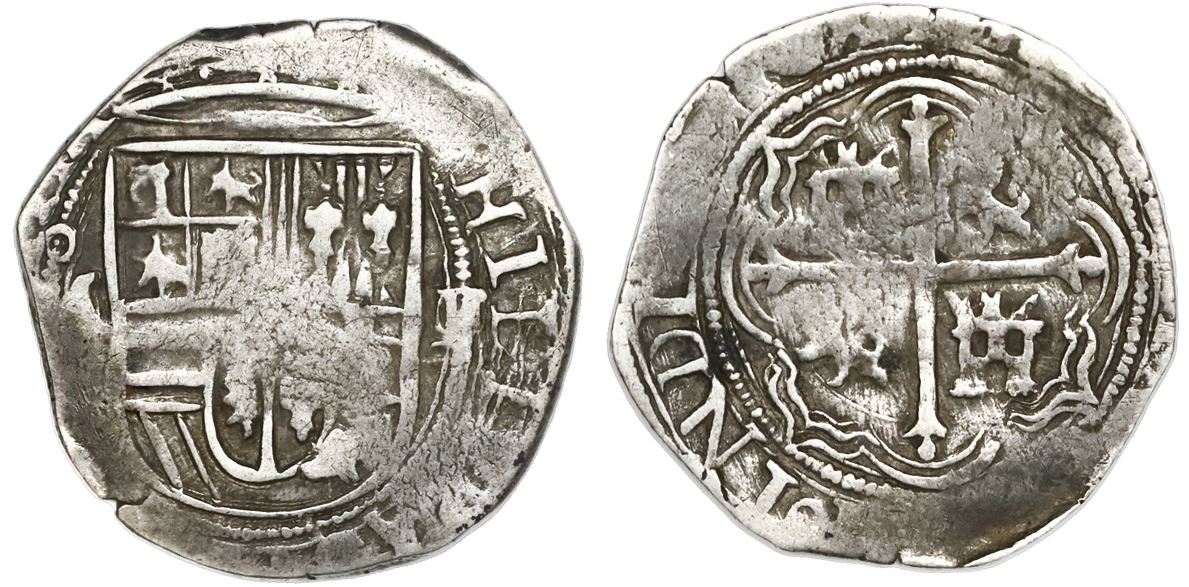 Mexico City, Mexico, cob 1 real, Philip II, assayer F/O to right, mintmark oM to left, rare. S-M12; KM-26 for type; Cal-228. 3.34 grams. Attractively toned AVF with flat streaks on otherwise full shield and cross, clear F/O assayer, most of king's name.