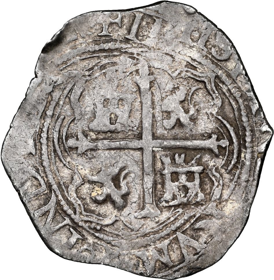 Mexico City, Mexico, cob 1 real, Philip II, assayer F to right, mintmark oM to left, rare, NGC XF 45. S-M12; KM-unl (26 for type); Cal-229. 3.27 grams. Much legend, including clear ordinal I I (with space) between figure-8 ornaments, assayer and king's name double-struck, good full shield and cross, crusty dark toning around details. Pedigreed to the Clyde Hubbard Collection. Please use this link to verify the certification number