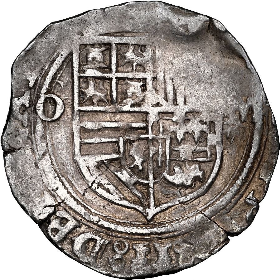 Mexico City, Mexico, cob 1 real, Philip II, assayer O punched over oM to left, new mintmark oM to right, GRATA error in legend, rare, NGC AU 55. S-M11; KM-unl (26 for type); Cal-unl. 3.34 grams. Bold full assayer to left covering a faint but certain oM, the new mintmark to right weak but clear, some legend including (the GRATA error weak but certain, not noted on label), good full cross and shield with brownish toning all over, hairline edge-splits. Pedigreed to the Clyde Hubbard Collection, with his original tag/envelope. Please use this link to verify the certification number