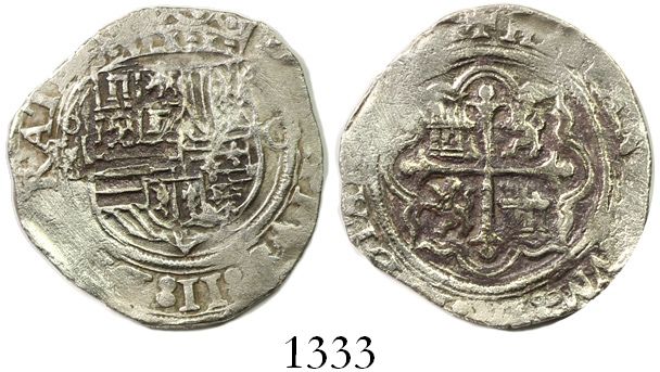 Mexico City, Mexico, cob 1 real, Philip II, assayer O to right, mintmark oM to left. S-M11; KM-26 ;CT-643. 3.20 grams. Choice cross, XF details with light surface corrosion and staining, bold king's ordinal II, doubled shield.