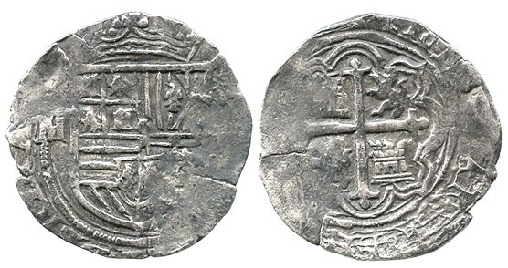 Mexico City, Mexico, cob 1 real, Philip II, assayer not visible (O or F), mintmark oM to left. KM-26. 3.3 grams. Typically broad, thin flan with sharp details (full shield and crown and cross), with clear mintmark to left but flat to right where assayer should be, toned XF with hairline edge-split.