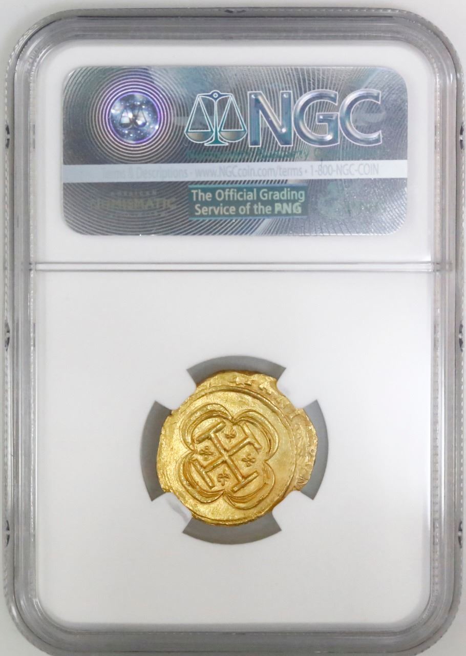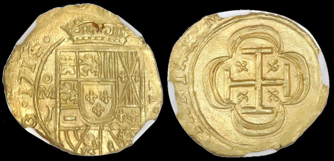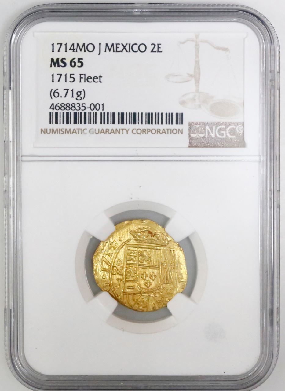 Mexico City, Mexico, cob 2 escudos, 1714J, NGC MS 65, ex-1715 Fleet (designated on label), ex-Dr. Frank Sedwick. S-M30; KM-53.2; CT-350. 6.71 grams. Finest specimen known, in our estimation, with very choice full date, oMJ, shield and cross, and with luster and sharp details all over (more like MS 66 or even 67 to our eyes), tiny spot of encrustation in crevices of crown. NGC #4688835-001. From the 1715 Fleet, pedigreed to our Auction #11, with original lot-tag #9.