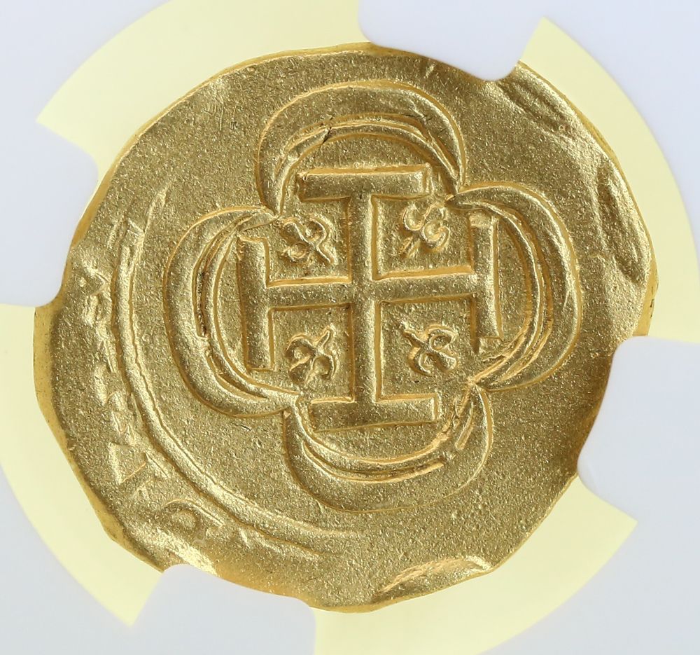 Mexico City, Mexico, cob 2 escudos, (1715J), from the 1715 Fleet, encapsulated NGC MS 61. S-M30; KM-53.2; CT-351. 6.7 grams. Choice full cross, off-center shield with tons of blank area above full crown. From the 1715 Fleet.