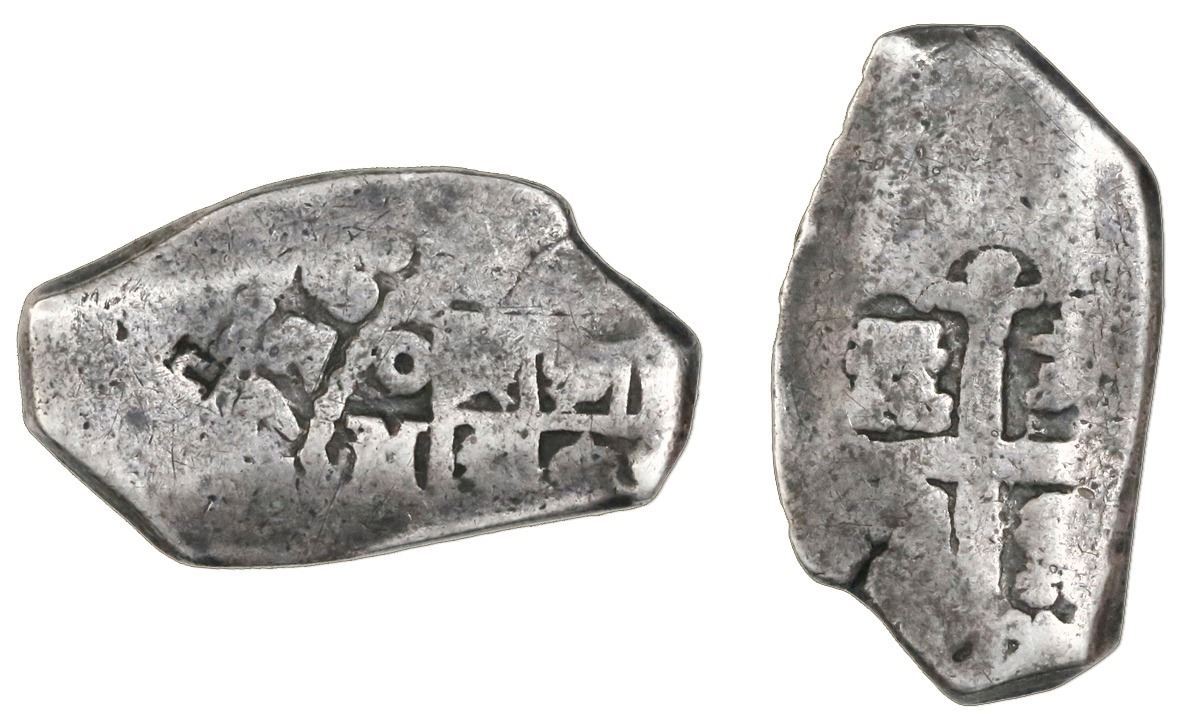 Mexico City, Mexico, cob 2 reales, (1)728(D), rare. S-M23a; KM-35. 6.64 grams. Oddly elongated flan with full date and mintmark, small chopmark(?) outside the design on that side, most of cross but all a bit worn (VG), nicely toned.