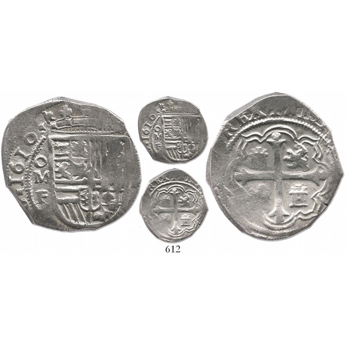 Mexico City, Mexico, cob 2 reales, 1610F, ex-Pullin collection, rare. S-M17; KM-unl (32.2); CT-344. 6.8 grams. Very full and bold date and oMF, good full shield and cross and most of crown, lightly toned AXF, nice round(ish) shape. Pedigreed to the John Pullin collection.