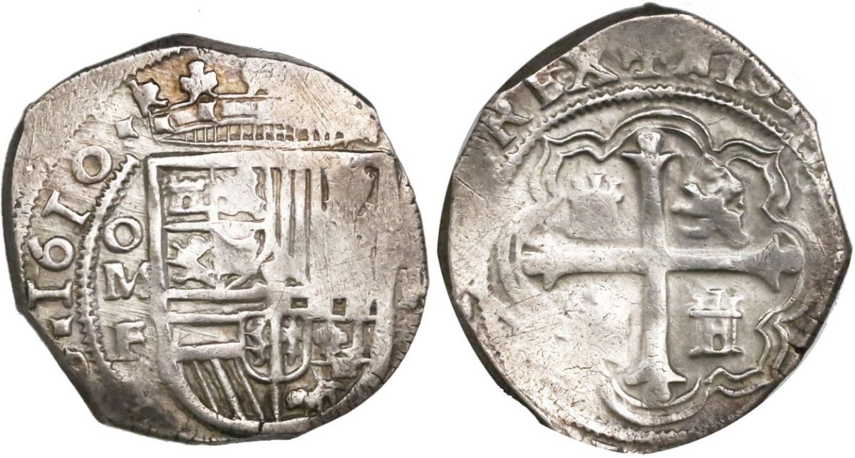 Mexico City, Mexico, cob 2 reales, 1610F, rare, ex-Pullin. S-M17; KM-unl (32.2); CT-344. 6.80 grams. Super bold and full date and oMF, good full shield and cross, XF with traces of luster, minor weak spots. Pedigreed to the John Pullin collection (Auction #10, with original lot-tag #612).