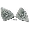 Mexico City, Mexico, cob 2 reales, 1731F. S-M26, KM-35a, CT-1269. 6.1 grams. Triangular flan with 100% full and bold date and oM, good but off-center cross, thick and uncorroded. Pedigreed to the Mark Bir collection. Recovered from: Princess Louisa, sunk in 1743 off the Cape Verde Islands, west of Africa