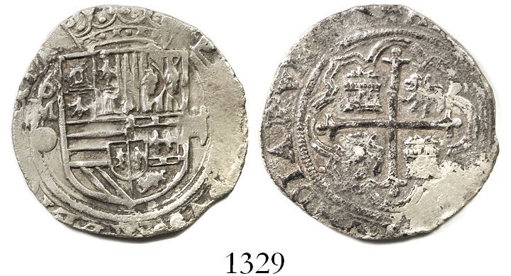 Mexico City, Mexico, cob 2 reales, Philip II, assayer O below mintmark oM to left. S-M11; KM-31 ;CT-501. 6.66 grams. VF+ details, dark toning and surface corrosion on reverse, good full shield and cross.
