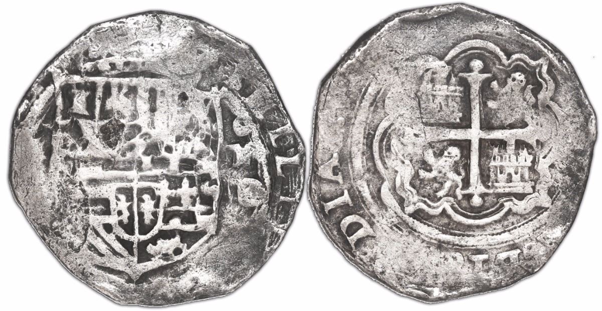 Mexico City, Mexico, cob 2 reales, Philip II, assayer O below mintmark oM to right. 5.97 grams. Full shield and cross but much cruder than usual for this era (flat peripheries too), VF+ with darkly toned fields, light surface corrosion.