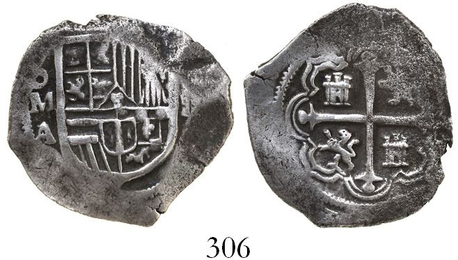 Mexico City, Mexico, cob 2 reales, Philip III, assayer A/F, Grade 1, pedigreed to the Atocha Research Collection (Plate Coin). S-M16. 6.18 grams. Superb specimen with outstanding full cross and shield, bold oMA/F, flat peripheries with a touch of corrosion at part of edge on reverse but very nicely toned. Pedigreed to the Atocha Research Collection and Plate Coin #167 in the catalog, also pedigreed to our Auction #6, with original lot-tag #163, and with special Fisher photo-certificate #237721. Recovered from: Atocha, sunk in 1622 west of Key West, Florida