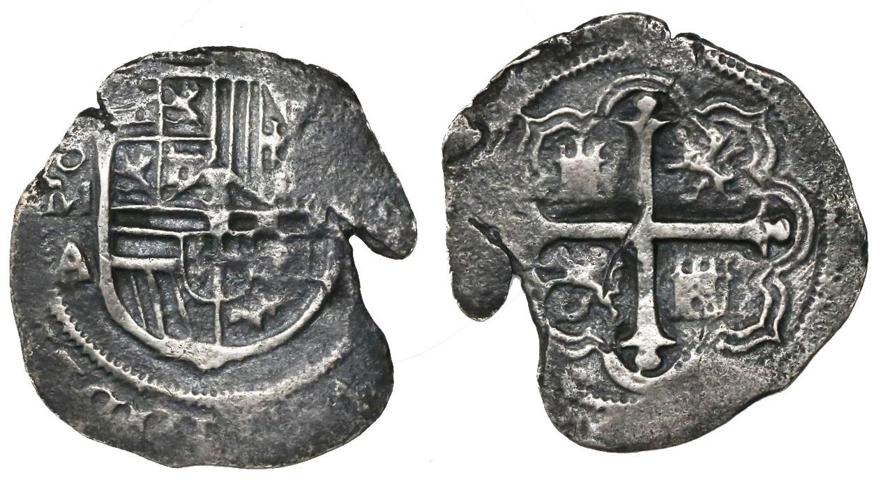 Mexico City, Mexico, cob 2 reales, Philip III, assayer A. S-M16; KM-37.2. 4.41 grams. Bold assayer, choice full cross and shield, nicely toned and minimally corroded, odd shape with edge-split. Recovered from: "Rill Cove wreck," sunk ca. 1618 off Cornwall, England