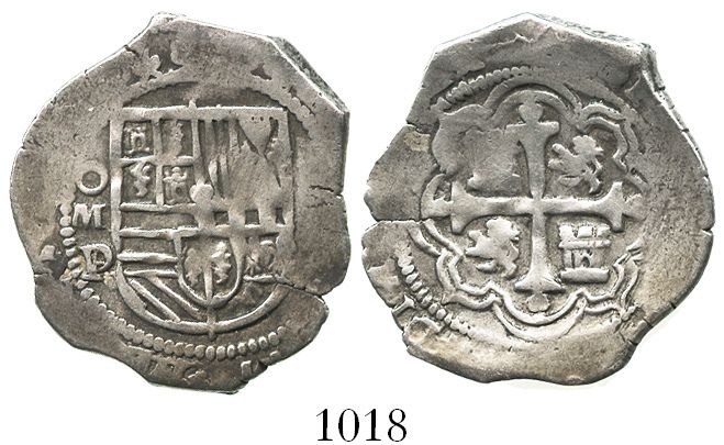 Mexico City, Mexico, cob 2 reales, Philip III, assayer D/F. S-M18; KM-32.2. 6.8 grams. Bold oMD with clear over-assayer, choice full shield and cross, nicely toned VF with hairline edge-split.