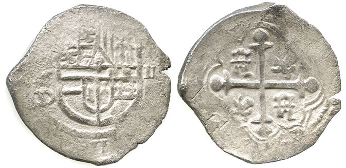Mexico City, Mexico, cob 2 reales, Philip III, assayer D. S-M18; KM-32.2. 5.7 grams. Choice full cross-lions-castles, good full shield with bold assayer to left and denomination II to right, AU details but with very light surface corrosion (no toning). Probably from the "Lucayan Beach wreck" (ca. 1628).