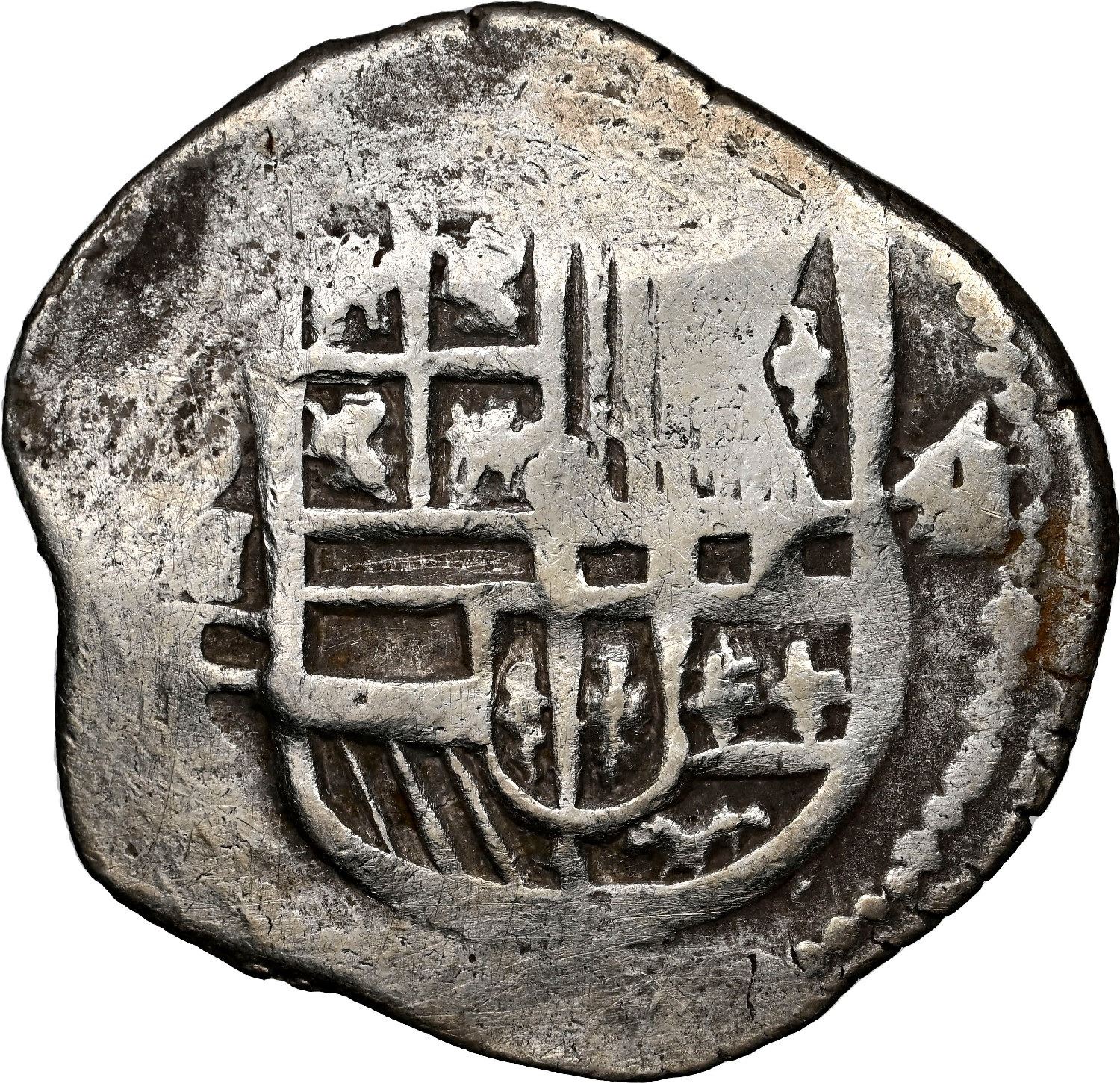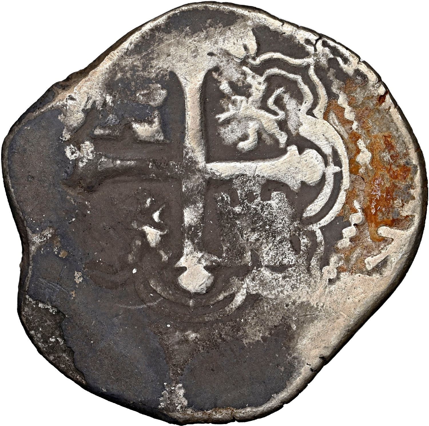 Mexico City, Mexico, cob 2 reales, Philip III, assayer F, denomination II/4, rare, NGC VF details / environmental damage, finest and only example in NGC census. S-M15; KM-32.2. 6.99 grams. This is the first example that we have seen of a denomination II over an erroneously punched Arabic 4 on a Mexico 2 reales of assayer F. The error, noted on the slab label, is very clear to the right of the full shield with assayer F visible to left; encrusted reverse but with full cross.