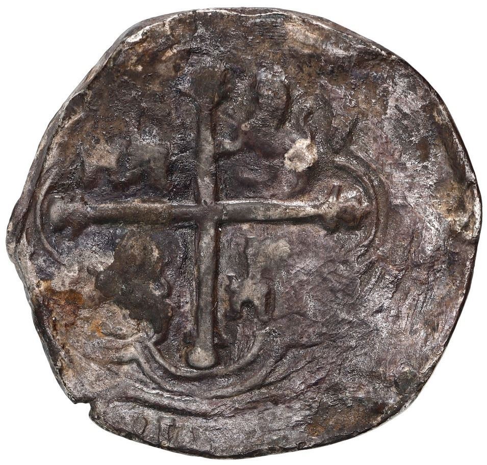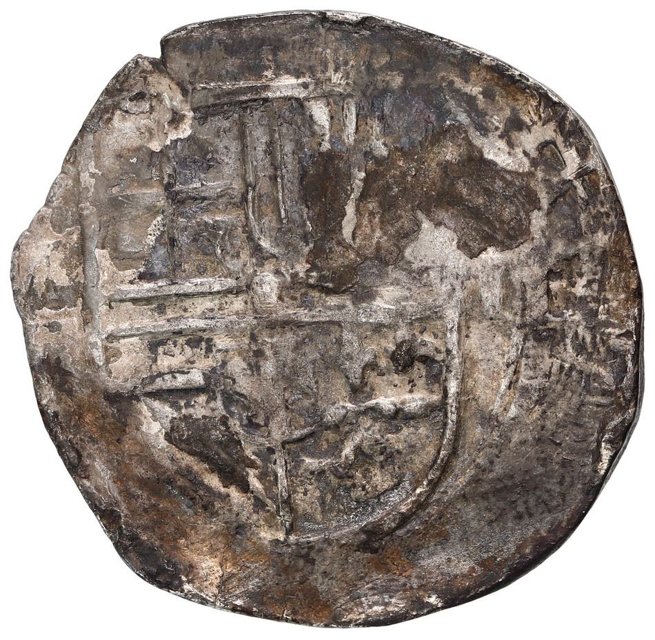 Mexico City, Mexico, cob 2 reales, Philip III, assayer F, rare variety with three 1/2R-sized castles in upper-left and bottom-right quadrants of cross. S-M12a; KM-unl; Cal-unl. 6.61 grams. Rare design-type with three small 1/2 real-sized castles used for each castle quadrant on the back. XF with spotty dark toning (probably salvaged), weak yet nearly full shield, nice bold cross.
