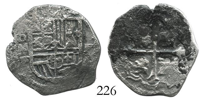Mexico City, Mexico, cob 2 reales, Philip III, assayer F, very rare from this wreck. 5.7 grams. Thin but with very bold full cross and shield, full oMF, lightly corroded and partially dark, first cob we have ever seen from this Dutch wreck. With salvagers' certificate #SA101. Recovered from: Campen, sunk in 1627 off the Isle of Wight, south of England