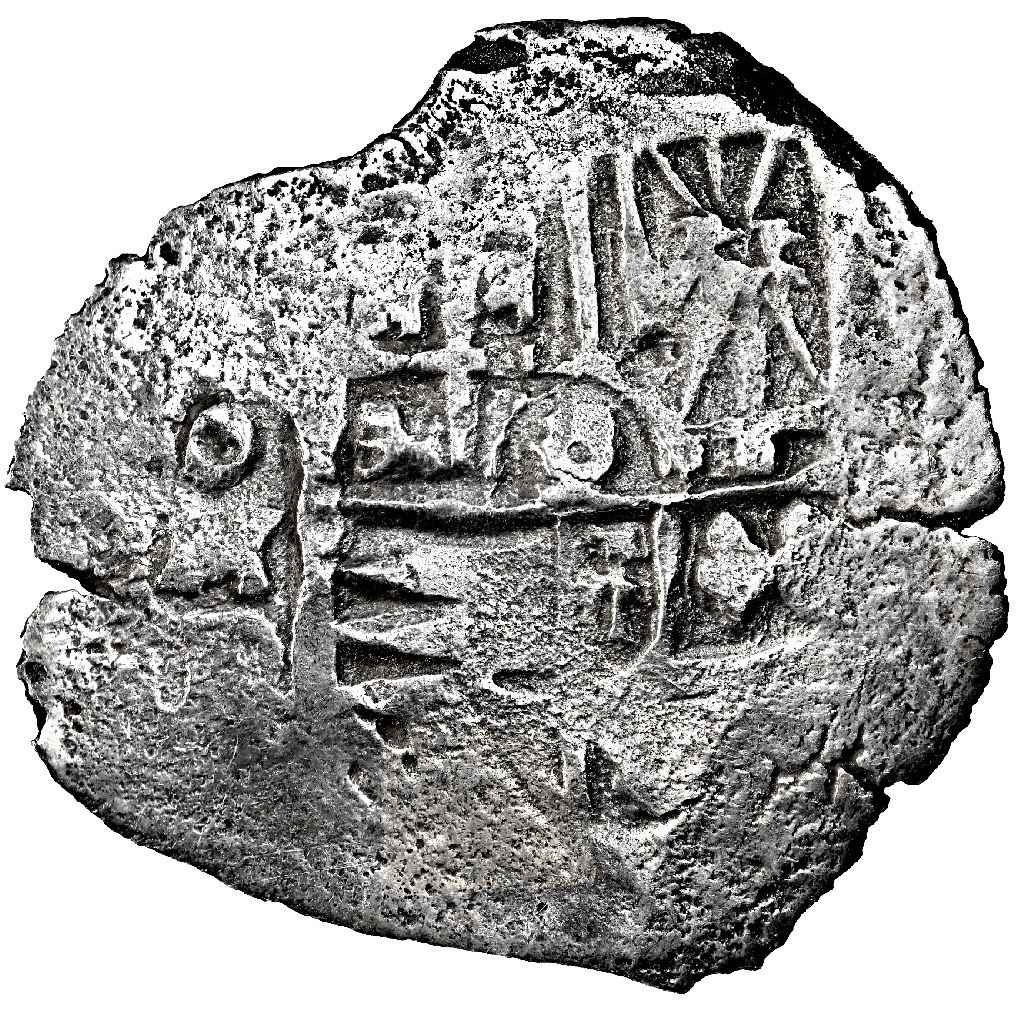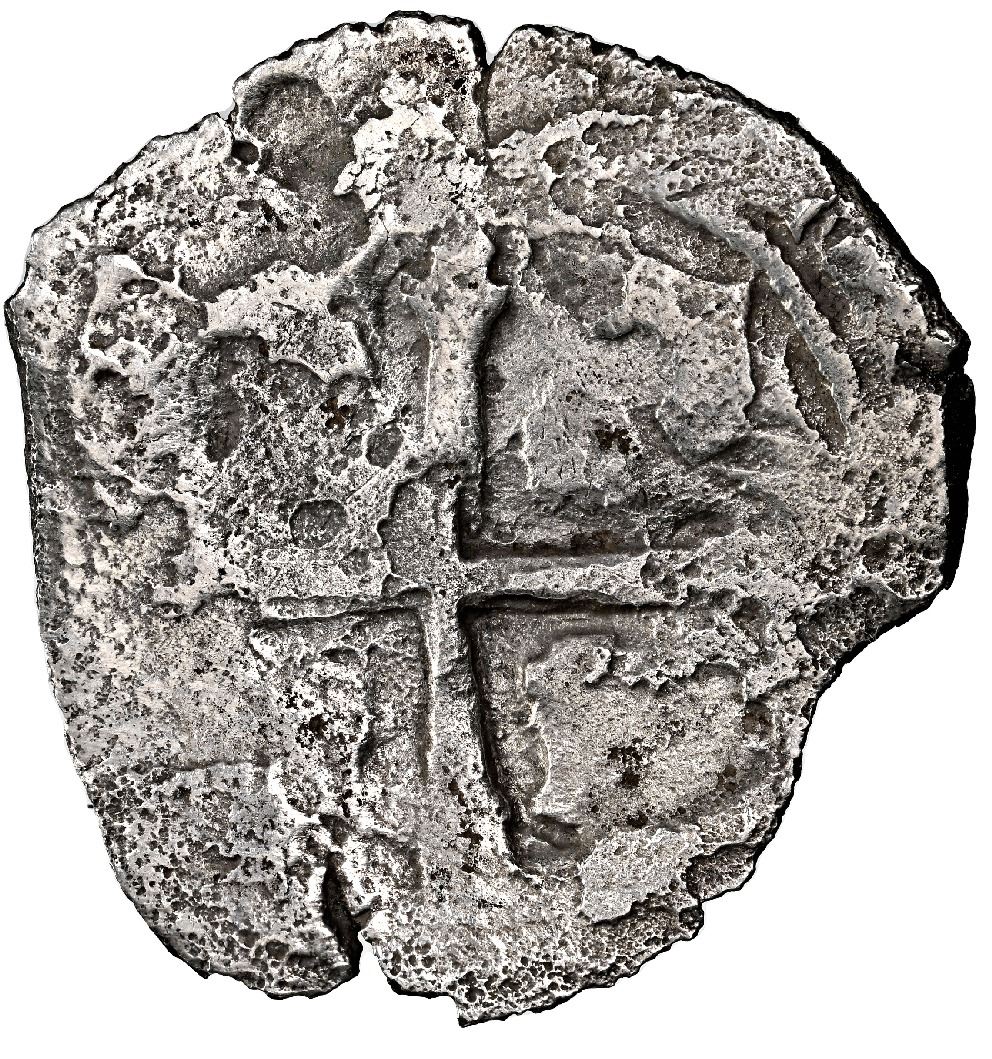 Mexico City, Mexico, cob 2 reales, Philip IV, assayer P, NGC XF details / saltwater damage / Concepcion (Shipwreck Blue Label). S-M19; KM-33. 5.47 grams. Nearly full shield with full oMP (the assayer not noted on slab), full but corroded cross, parts of edge slightly crude, lightly toned all over. Pedigreed to the 45th Anniversary Collection, with original tag 53808 and official (generic) Letter of Authenticity. Recovered from: Concepcion, sunk in 1641 off Hispaniola