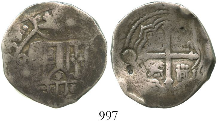 Mexico City, Mexico, cob 4 reales, (1)650/49(P), rare, with punchmark and countermarks on reverse as from circulation in Indonesia (?). S-M19; KM-unl. 13.5 grams. Round flan with clear bottom half of date, full cross with countermarks in periphery, weak shield due to concavity of flan, richly toned Fine.