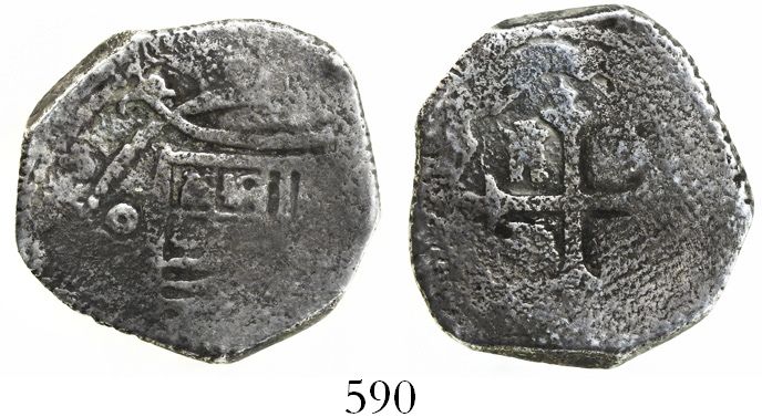 Mexico City, Mexico, cob 4 reales, (1)681(?)(L), with canvas impression on reverse. S-M21. 10.76 grams. Good crown above off-center shield, full and well-centered cross with crosshatch pattern, nicely toned, less corroded than most. Recovered from: Joanna, sunk in 1682 off South Africa