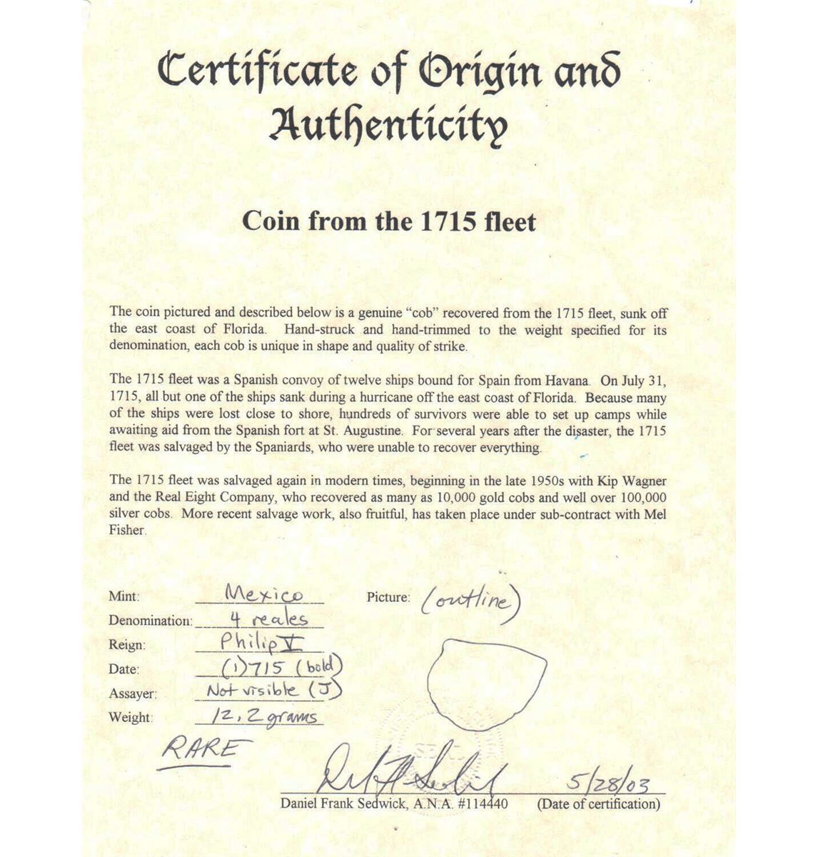 All items are genuine unless noted. Most shipwreck coins and artifacts come with a certificate of authenticity (please check the description for each item). By bidding in this auction you understand and agree to the Terms and Conditions posted here.