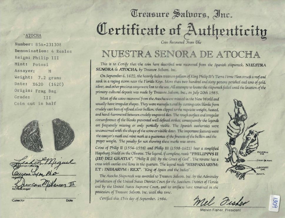 Mexico City, Mexico, cob 4 reales, (16)20(F), Grade 3, ex-Atocha (1622), mounted cross-side out in 14K gold bezel with shackle bail, anchor and dolphin embellishments. 15.23 grams total. Decent details, including bold date and mintmark, but with tangential third of the coin lost to corrosion, with straight sawblade strip of gold accentuating that side, the rest embellished with two anchors and three dolphins. From the Atocha (1622), with Fisher tag and certificate #231308 (mis-attributed to Potosi mint on certificate only). Recovered from: Atocha, sunk in 1622 west of Key West, Florida