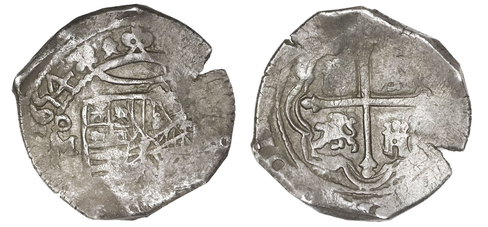 Mexico City, Mexico, cob 4 reales, 1654P, NGC AU 50. S-M19; KM-38; Cal-1072. 13.83 grams. Choice bold date (100% full) and oM, full cross and most of crown and shield, deeply toned all over, edge-split. NGC #5850122-001.