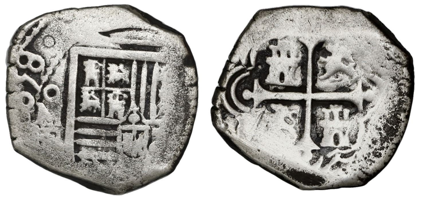 Mexico City, Mexico, cob 4 reales, 1658(P). S-M19; KM-38; Cal-1076. 12.94 grams. Bold 58 of date, good full cross and nearly full shield, VG with dark, contrasting toning in crevices.