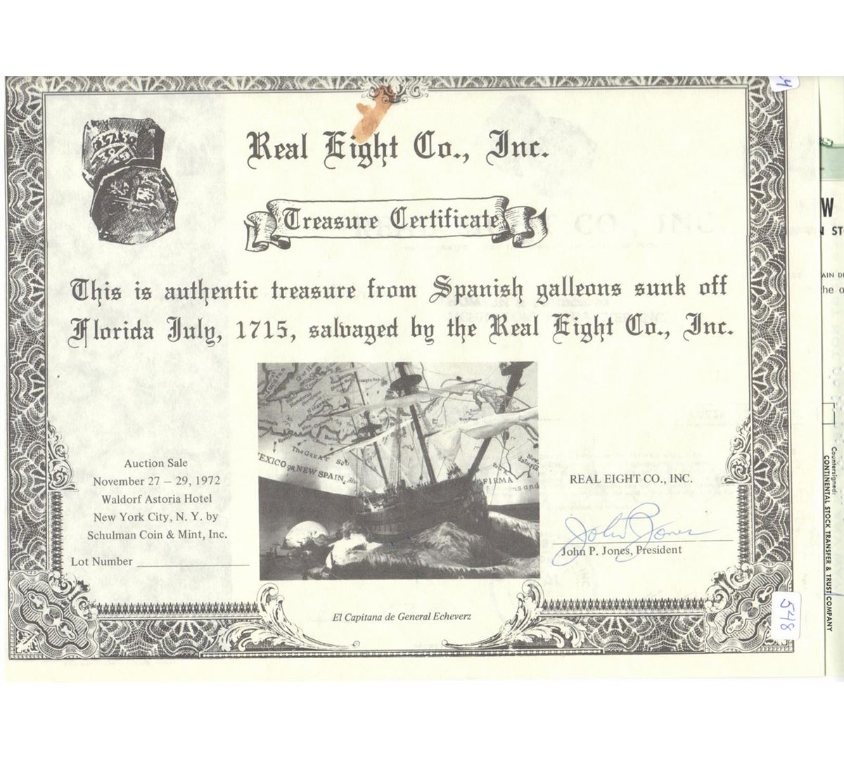 Mexico City, Mexico, cob 4 reales, 1713J, full date (rare thus), ex-Real Eight. S-M22; KM-40; CT-1018. 13.49 grams. Somewhat rectangular shape, very solid and uncorroded (also nicely toned), with very bold 17 of date and full oMJ, most of cross and shield. With Real Eight Co. certificate from 1972 and stock certificate for one share. Recovered from: Spanish 1715 Fleet, east coast of Florida