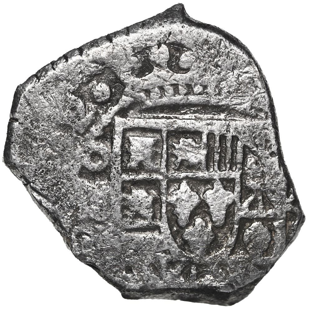 Mexico City, Mexico, cob 4 reales, 1732 (F). S-M26; KM-40a; Cal-1096. 12.97 grams. Nearly full shield and most of crown with clear 2 of date and mintmark oM, nearly full cross, minimal surface corrosion, toned in crevices. Recovered from: Vliegenthart, sunk in 1735 off Zeeland, Netherlands