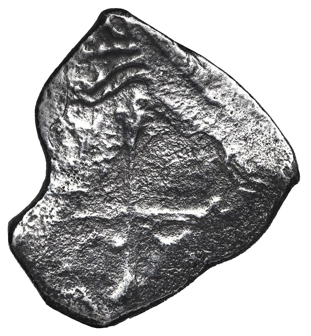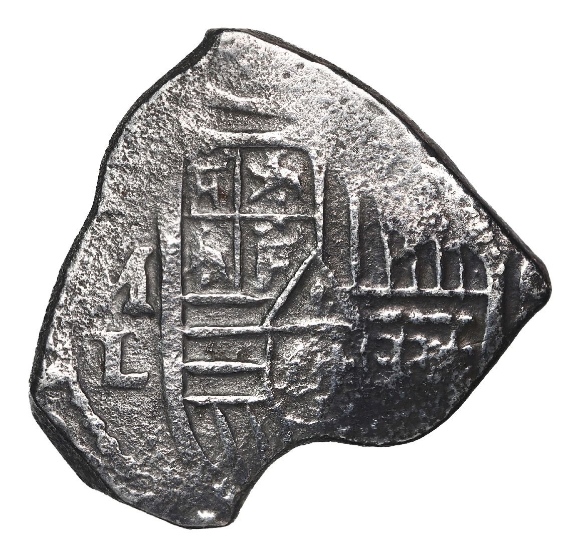 Mexico City, Mexico, cob 4 reales, Charles II, assayer L. S-M21; KM-39. 10.99 grams. Remarkably bold shield with full assayer L, corroded cross, interesting shape, lightly toned. With generic certificate hand-signed by the salvors. Recovered from: Joanna, sunk in 1682 off South Africa