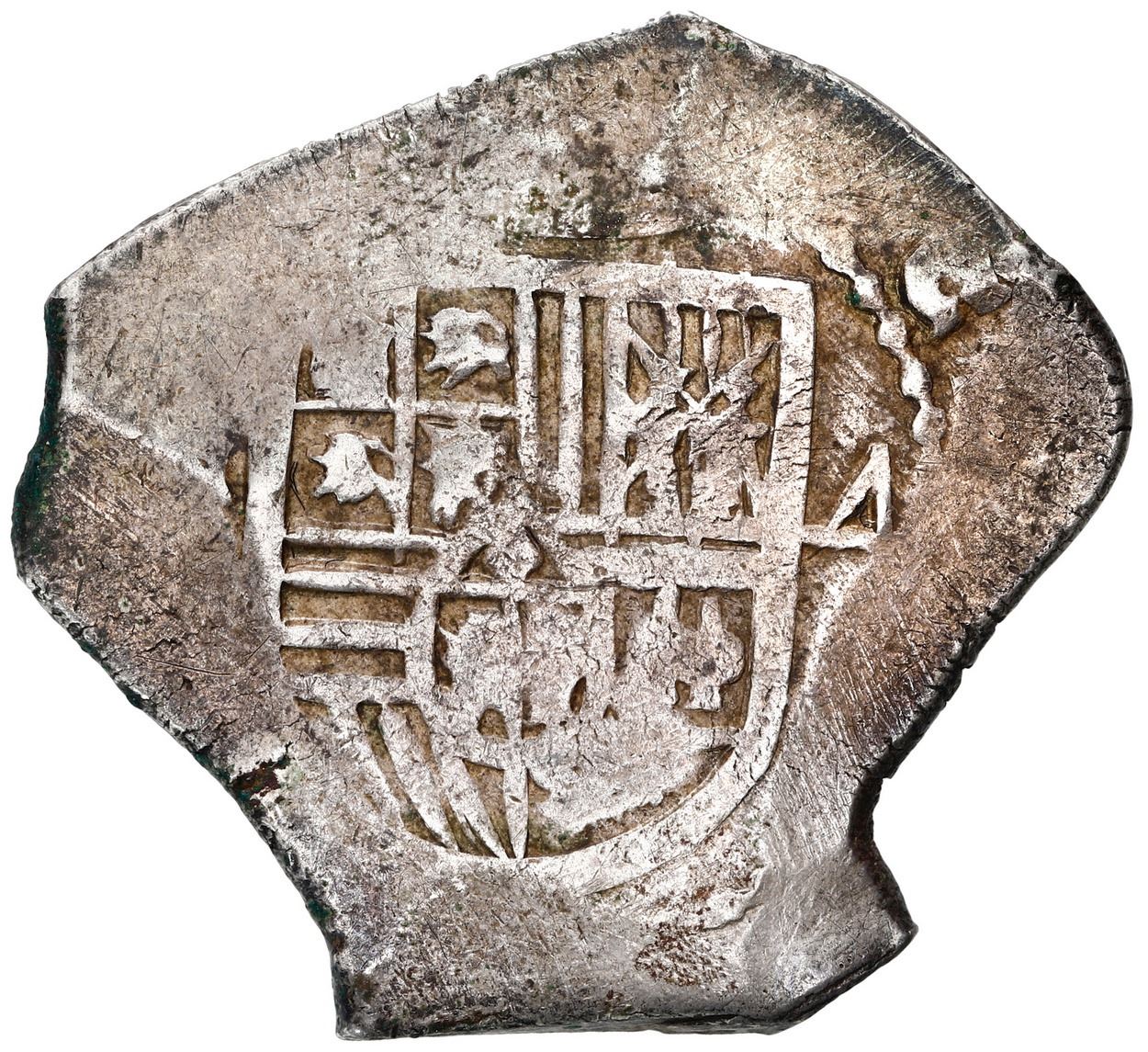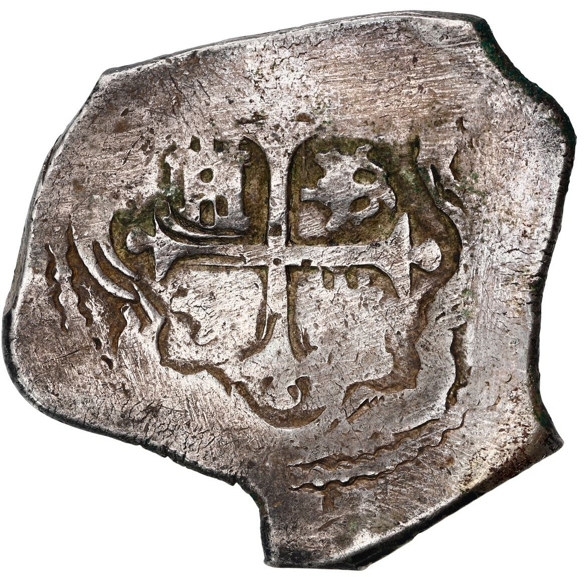 Mexico City, Mexico, cob 4 reales, Charles II, assayer not visible. KM-39. 13.66 grams. Interesting shape for this early-style piece. AU with dark silver-toned surfaces, bold shield along with C of king's name and denomination 4 visible, complete cross.