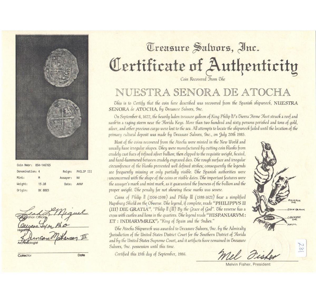 Mexico City, Mexico, cob 4 reales, Philip II, assayer F, Grade-1 quality but no Grade on certificate. S-M12; KM-36. 13.26 grams. Good full shield and cross despite weak spots, minimal surface corrosion only. With Fisher certificate #146765. Recovered from: Atocha, sunk in 1622 west of Key West, Florida