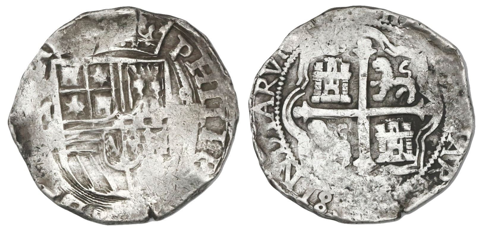 Mexico City, Mexico, cob 4 reales, Philip II, assayer F below mintmark oM to left, denomination o-IIII to right. S-M12; KM-36; CT-328. 13.57 grams. Good full shield and bold full cross with late-style lions (legs on ground), nearly full king's name and crown, VF+ with spotty toning.