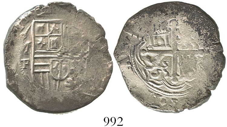 Mexico City, Mexico, cob 4 reales, Philip II, assayer F below oM mintmark to left. S-M12; KM-36. 13.5 grams. Full shield and cross with XF details, also full oMF, but peripheries flat, dark spots around edge.