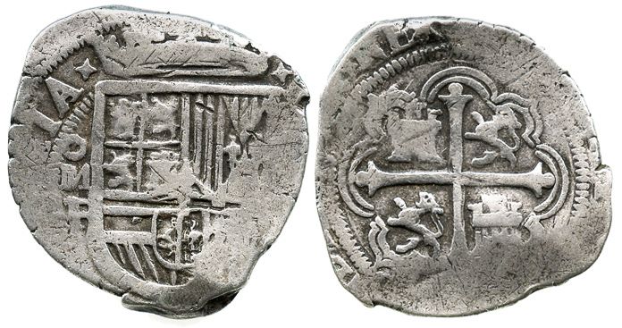 Mexico City, Mexico, cob 4 reales, Philip II, assayer F. S-M12; KM-36. 13.5 grams. Good full cross and shield, full oMF, AVF with some flatness but contrasting toning.