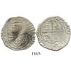 Mexico City, Mexico, cob 4 reales, Philip II, assayer F. S-M12; KM-36. 13.8 grams. Roundish flan with full shield and cross, some legend, clear oMF, AVF with some weak spots and some areas of toning.