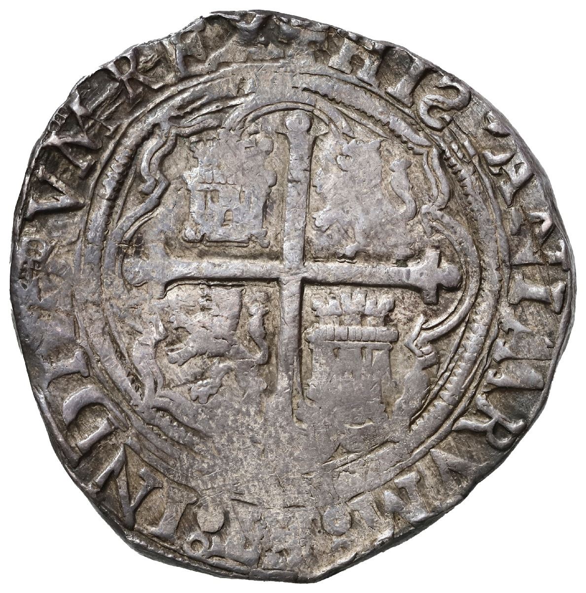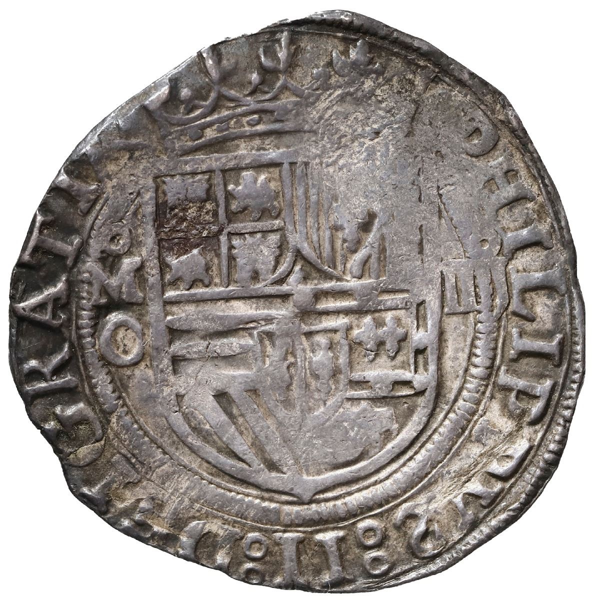 Mexico City, Mexico, cob 4 reales, Philip II, assayer O below mintmark oM to left, denomination o-IIII to right, retrograde S's in legend. S-M11; KM-36; Cal-505. 13.66 grams. Broad flan with full legends (the king' s ordinal II particularly bold) and crown, bold oMO and denomination o-IIIII, full but weaker shield and cross, richly toned AVF. Pedigreed to the Clyde Hubbard Collection of Mexican silver cobs, accompanied by original tag or holder.