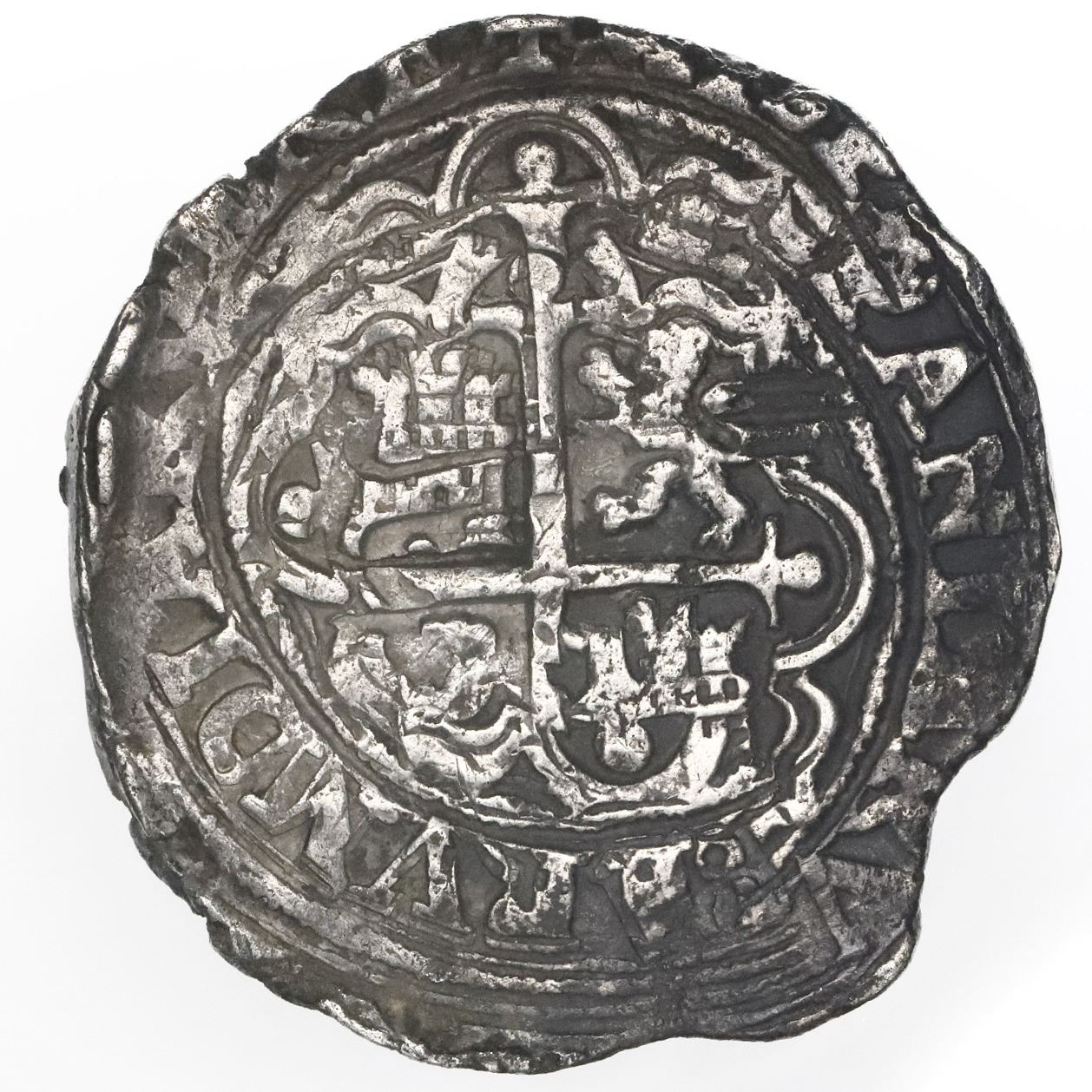 Mexico City, Mexico, cob 4 reales, Philip II, assayer O below mintmark oM to left, denomination oIIII to right. S-M11; KM-36; Cal-505. 13.18 grams. VF with full shield and a widely doubled cross, plenty of detail in the legends including much of the king's name and ordinal, some scuffs on the darkly toned surfaces.