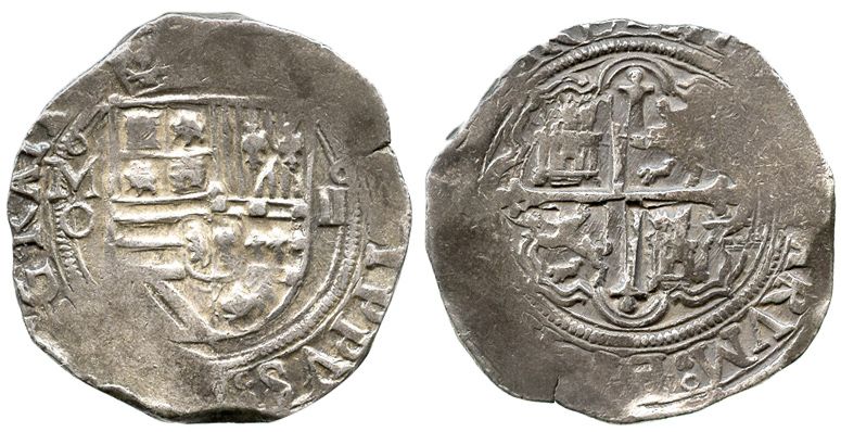 Mexico City, Mexico, cob 4 reales, Philip II, assayer O below mintmark oM to left.