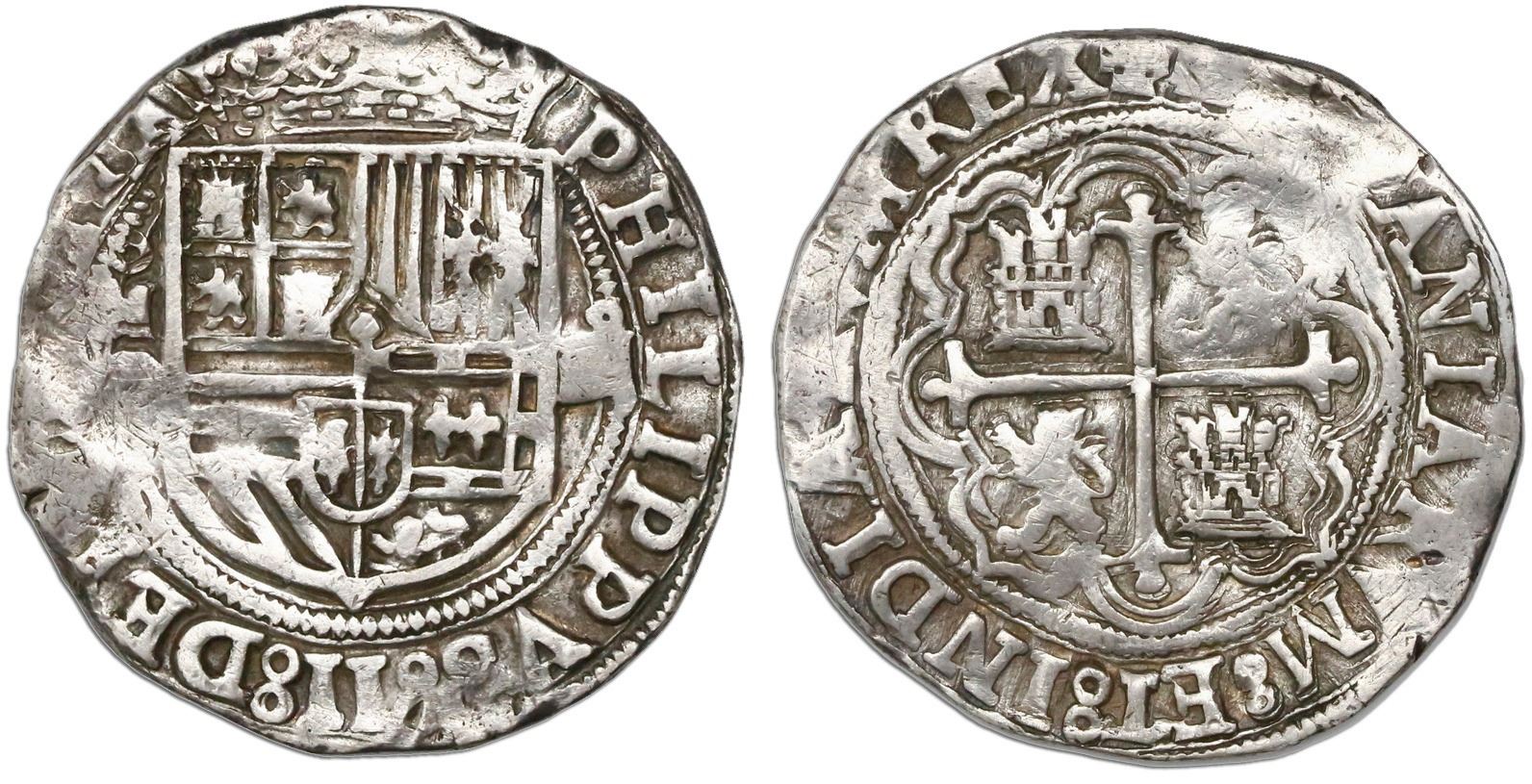 Mexico City, Mexico, cob 4 reales, Philip II, assayer O below mintmark oM to left.
