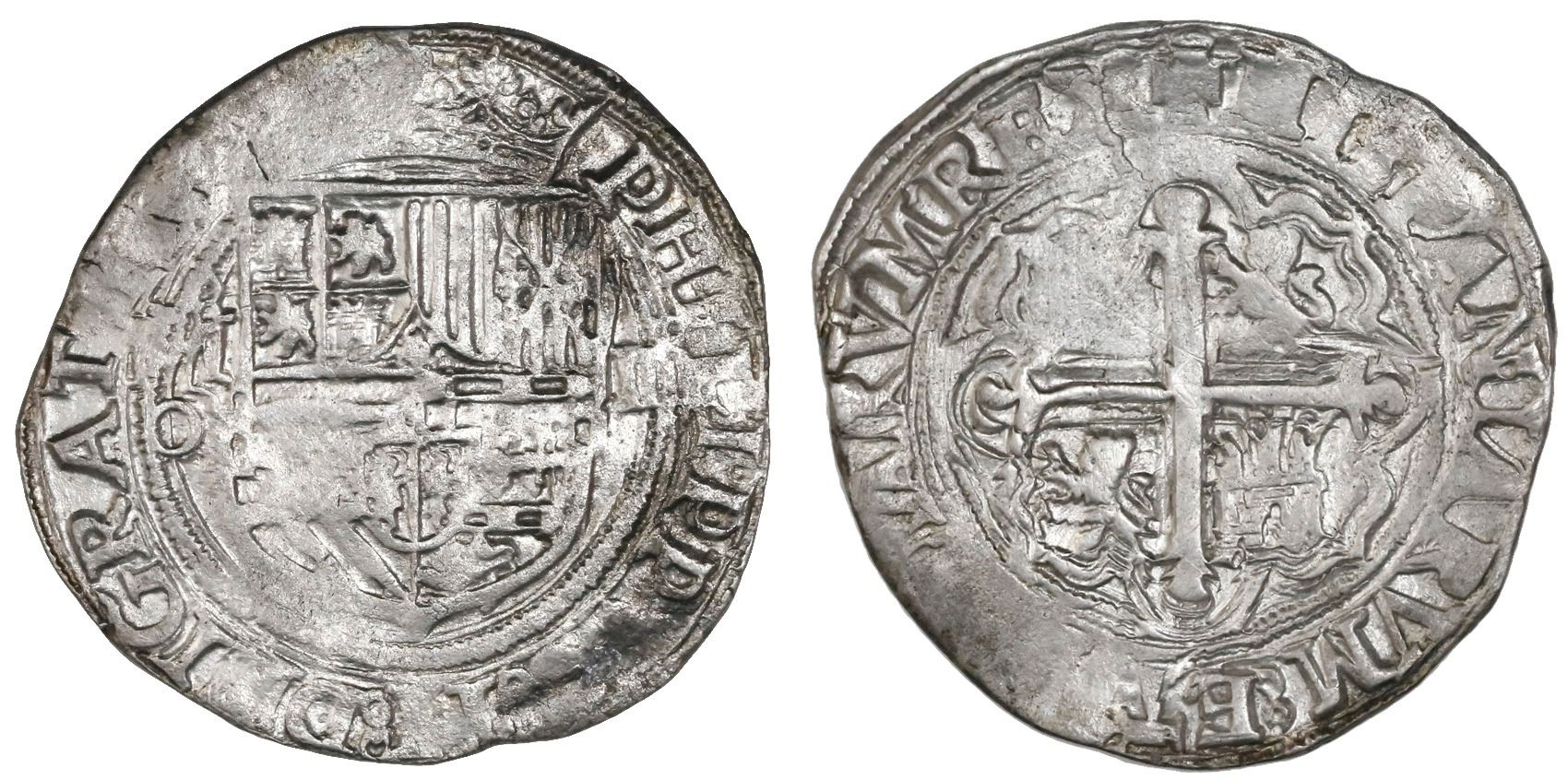 Mexico City, Mexico, cob 4 reales, Philip II, assayer O below mintmark oM to left. S-M11; KM-36; CT-335. 12.65 grams. Frosty, non-toned XF on a broad flan with nearly full details (including legends), traces of luster, a few small flat spots.