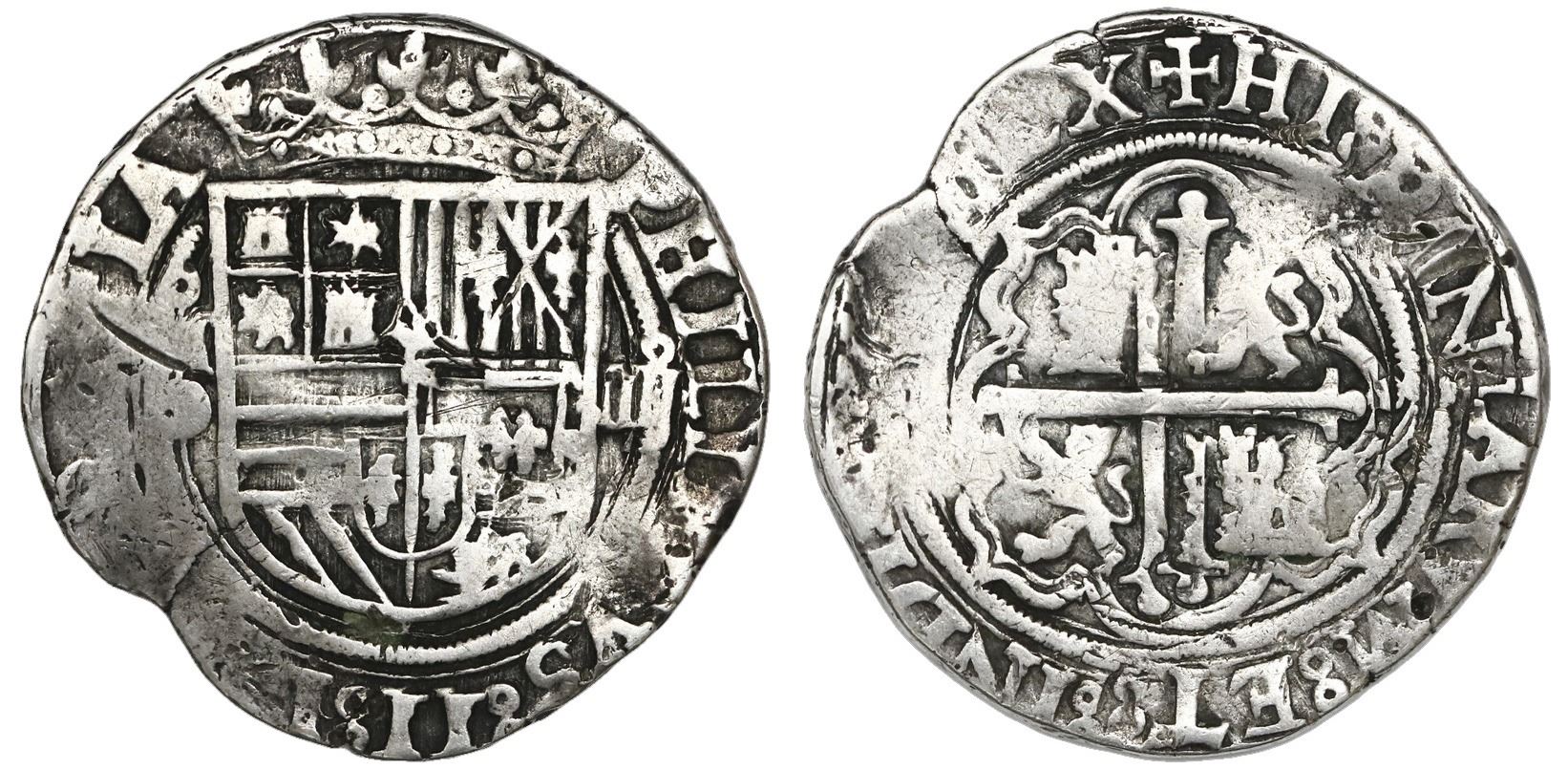 Mexico City, Mexico, cob 4 reales, Philip II, assayer O below mintmark oM to left. S-M11; KM-36; Cal-505. 13.43 grams. Broad-flan AVF with full and well-detailed shield and cross (the latter doubled) with contrasting toning on fields, lots of legend (including full king's ordinal II), full crown, old mark in weak area over oMO to left.